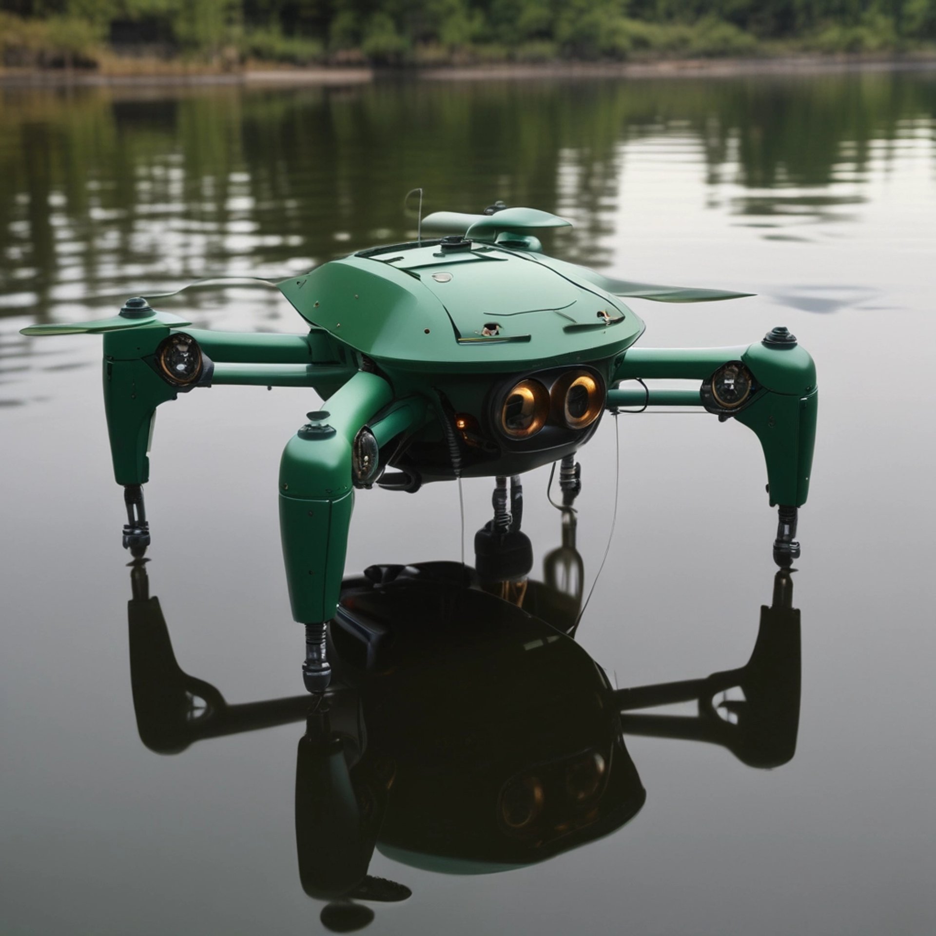 Nosso drone é inspirado na arraia manta e no sapo anfíbio, equipado com câmera 4K e sensores para catalogar flora e fauna aquática no Brasil.